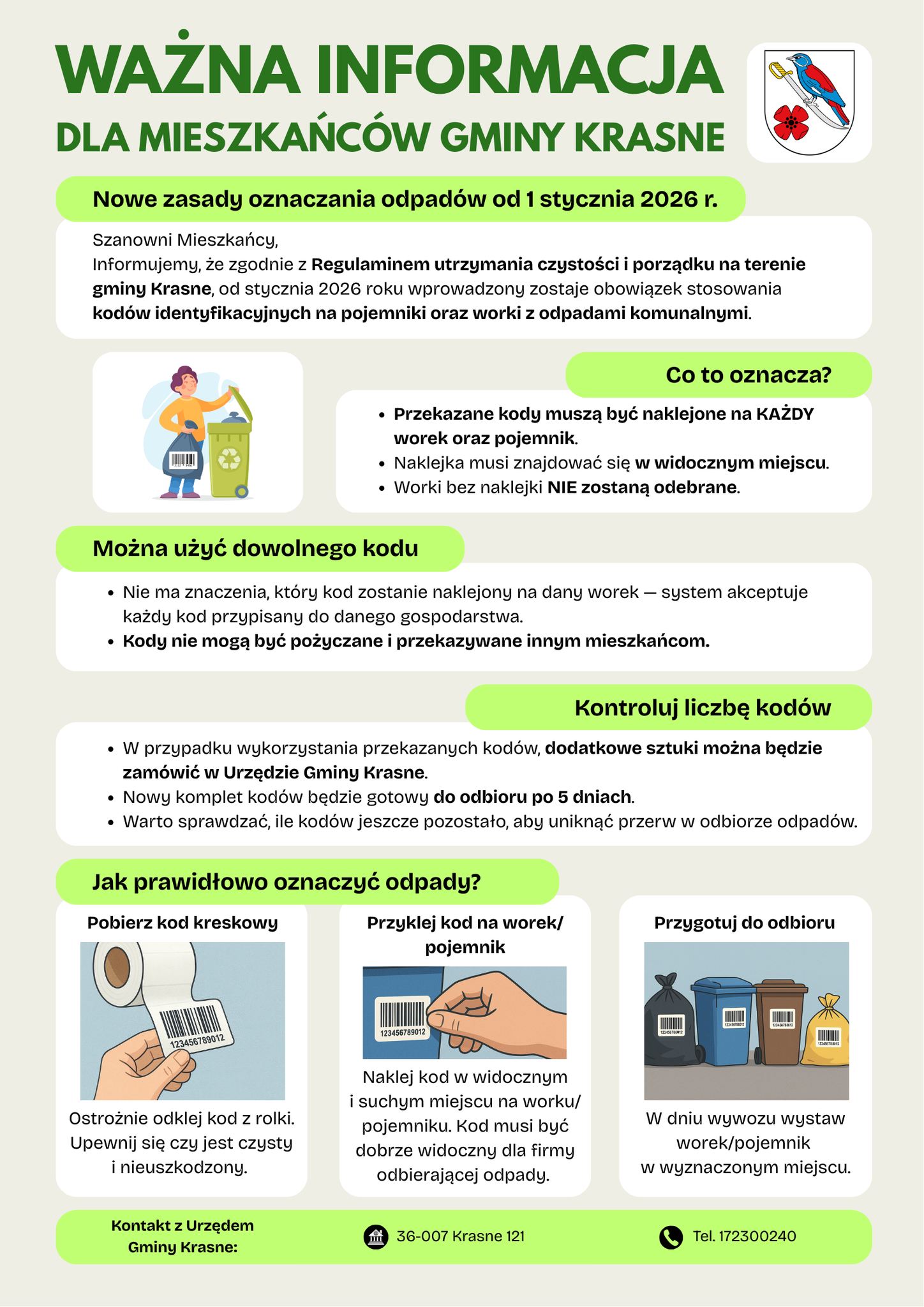Od 1 stycznia 2026 roku na terenie Gminy Krasne zostanie wdrożony nowy system identyfikacji pojemników i worków na odpady komunalne. System będzie oparty na indywidualnych naklejkach z kodami kreskowymi, przypisanych do konkretnego gospodarstwa domowego.